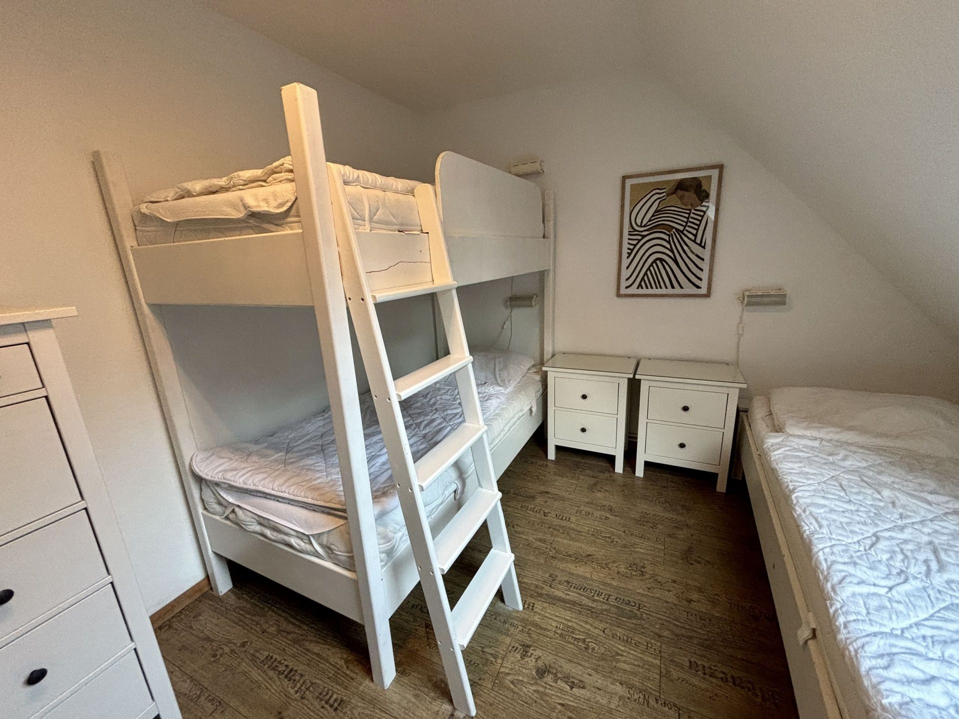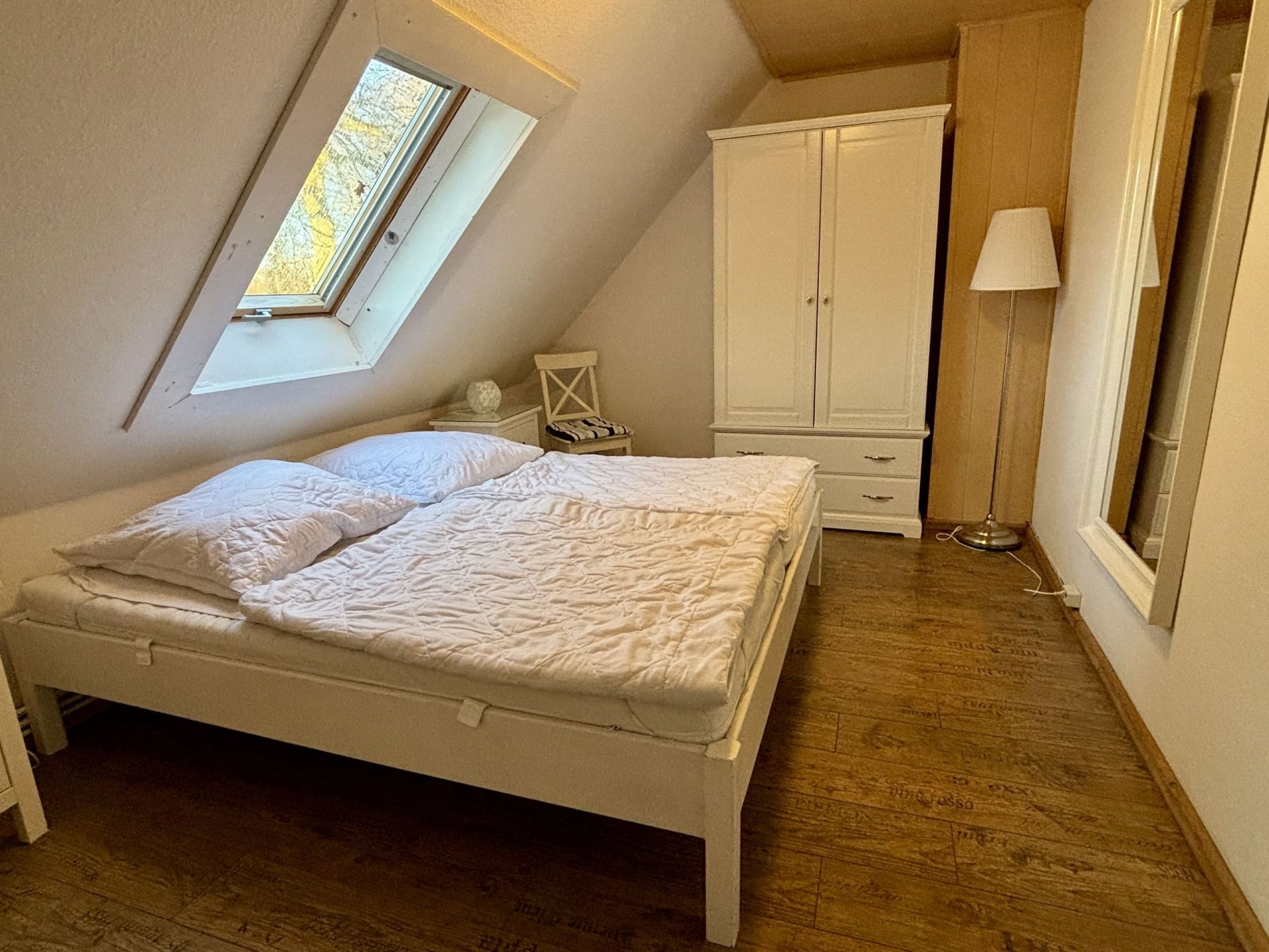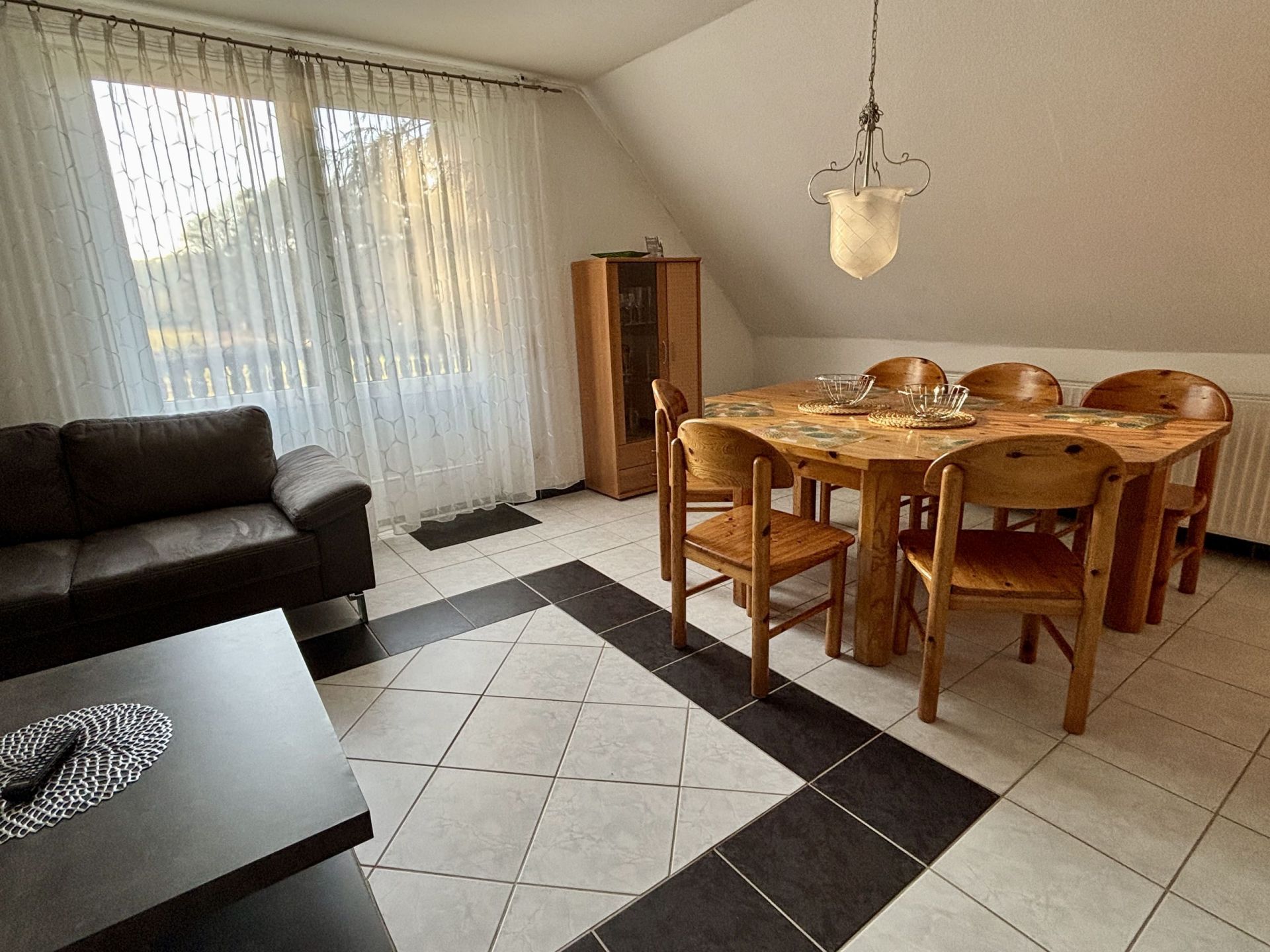 Diese Wohnung liegt direkt am Aufenthaltsraum und wird besonders gern von Gruppen, Kindergärten oder Familientreffen gebucht, die sich dann im angrenzenden Kaminraum gemeinsam Aufhalten, Essen und Feiern können.